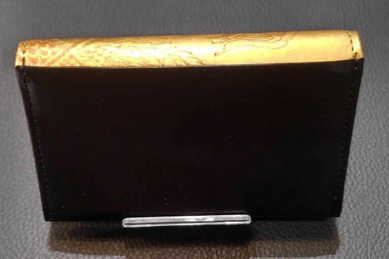 カードケース「金龍素地」です。職人さんが一つひとつ手間を惜しまず、日本の伝統工芸品である純金箔を貼った革でお作りしたカードケース「金龍素地」。